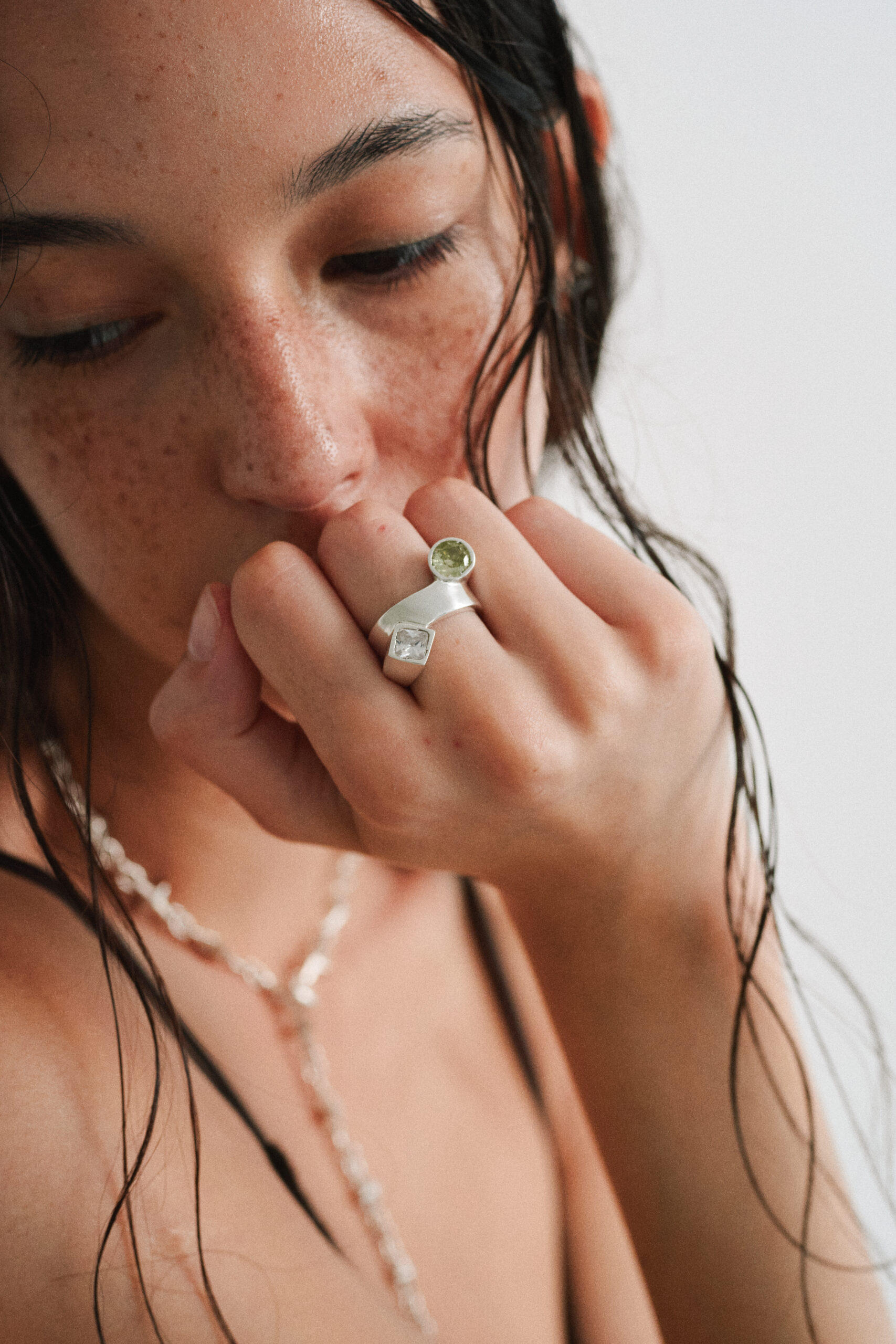 Éste anillo es elaborado a mano, modelado en cera, fundido en Plata 925 y finalmente engarzado con una circonia cúbica esmeralda circular y una cuadrada color cuarzo.